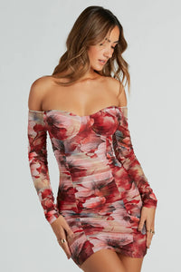 This bold blooming floral mesh mini dress is perfect for your spring parties! Detailed with an alluring abstract floral print on the airy lined mesh fabric, this mini-length dress will catch all the glances. The off-the-shoulder sweetheart neckline gives off a romantic look, while the bust seam outline adds a sultry flair. The all-over ruched detailing will accentuate your curves and showcase your gorgeous figure on the bodycon silhouette. Style this short dress with sleek mules.