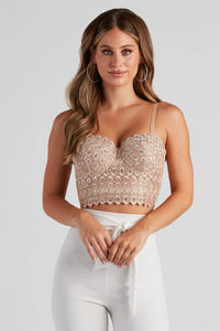 Bring the glamour and luxe in this lace bustier top, perfect for a date night or thrilling GNO. This waist-defining bodice is designed with underwire padded cups for a subtle lift and smooth support. The flattering sweetheart neckline allows for the perfect display for delicate layers of necklaces, for an extra touch of sparkly and glam. The intricate lace bodice is adorned with beaded rhinestones and sparkling sequins that will elevate any going-out look. Style this bustier with high-rise jeans or a mini skirt for a fierce and sultry look.
