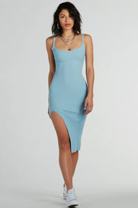 Achieve a perfectly stylish everyday look with this sleeveless ribbed knit midi dress! Designed with a comfortable ribbed knit fabric offering plenty of stretch, it features a V-neckline, spaghetti straps, a midi-length hem with a chic high front slit, and a form-hugging silhouette. Pair with a cropped denim jacket and clear mules.