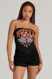 Feel fierce and fly in this graphic tube crop top! The strapless neckline and pointed crop hem add a touch of sexiness, while the front graphic with the script "Hustle Crew" inspires you to keep hustling. Complete the look in denim shorts for casual plans!