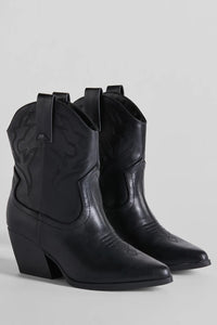 Pay a visit to the country bar in these western booties! Strut looks cute in these shoes featuring a pointed toe, a western-inspired design, and a stacked block heel, on faux leather material. Complete the look in a denim romper.