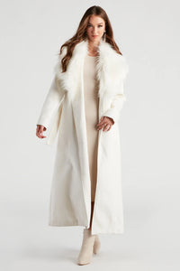 Make it a formal affair with a coat that brings that extra touch to your dressy outfits. The coat features a collared neckline, a removable faux fur collar, long sleeves, a tie-waist belt, and a long length with a center-high slit at the back. The long coat is composed of a lined faux wool fabric that offers a relaxed fit. Complete look with thigh-high boots.