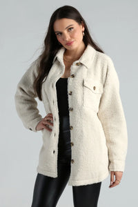 Layer on all the cozy vibes with this trendy faux sherpa shacket! It features a collared neckline, long sleeves, a button-down front, buttoned chest pockets, side pockets, and a relaxed oversized fit for that ultra-comfy feel. The soft faux sherpa fabric includes a cotton-blend lining. Pair this adorable shacket over a basic bodysuit with faux leather leggings and combat boots!