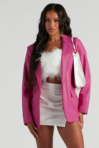 Keep your fall and winter wardrobe trendy with this sleek faux leather blazer! It features a lapel collar, an open front with a single button closure, long sleeves, front pockets, and a chic oversized fit. The faux leather fabric includes a smooth lining. Style over a corset top and mini skirt.