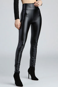 Elevate your faux leather leggings for a high-shine finish for a sleek and fierce look. Create a captivating going-out look with these high-waist leggings with a flattering wide waistband and skinny-leg silhouette. Style your faux leather leggings outfit with a lace bustier and sparkly statement earrings.
