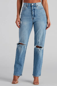 Create a dramatic moment with distressed jeans that add an edge to your look! The medium-wash denim jeans feature a flattering high-rise waist and a boyfriend silhouette with trendy knee slits. Complete the look with a crop top and combat boots.
