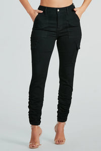 Create an effortless vibe in this denim skinny jeans! Featuring a flattering high-rise waist, front pockets lower flap cargo pockets, and unique side ruched hem seams, these jeans combine style and function. Made with premium denim fabric for a comfortable fit that holds its shape and offers a slight stretch. Style with a smooth knit tee for casual plans!