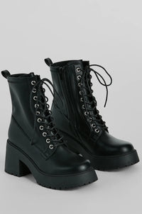 You'll be looking tough girl chic all season in these faux leather combat booties perfect for adventures downtown or concerts! These boots are designed with a round toe and lace-up placket for a classic combat style and a platform lug sole and block heel provide both style and stability, making these boots perfect for all-day wear. Elevate your style game with these fierce and functional booties by pairing them with an edgy crop jacket.