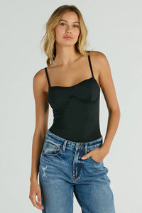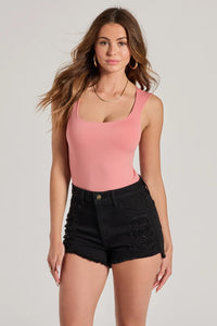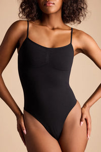 Simply the best basic bodysuit for all of your styling needs! It features a sleeveless square neckline, tank-style straps, a form-hugging fit, and a thong bottom with dual snap-button closures. The bodysuit is composed of a buttery soft, double-lined knit fabric with a moderate stretch. Complete the look in an oversized blazer, jeans, and heels for a day and night outfit!