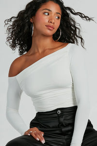 You'll be looking simply flawless in this smooth knit off-the-shoulder top. It features an asymmetric off-the-shoulder neckline with pleated detailing, long fitted sleeves, ruching down the side seams, a mid-length hem, and a form-hugging fit. The double-lined smooth knit fabric offers a seamless look with plenty of stretch. Style with cargo pants and mules!