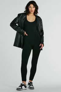 An easygoing day is to be had in this seamless knit jumpsuit - perfect for lounging, coffee runs, or errands! This jumpsuit is made from a seamless rib knit stretchy fabric and boasts a sleeveless scoop neckline, a flattering form-hugging fit, and a skinny leg design. Complete the look in an oversized jacket and sneakers!