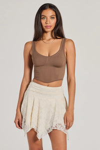 You'll always feel adorable in this basic crop top perfect for layering or styling on its own! The top is crafted from a seamless knit fabric offering plenty of stretch and comfort. It features a flattering scoop neckline, shoulder straps, and a fitted crop hem. Complete the look in denim shorts.