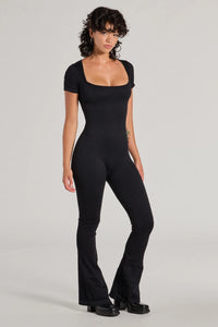 Strut it out in catsuit that is perfect for the everyday! The seamless knit catsuit features short sleeves, a square neckline, and a straight leg with flared hem. Complete look with lug boots and a moto jacket for your next night out!